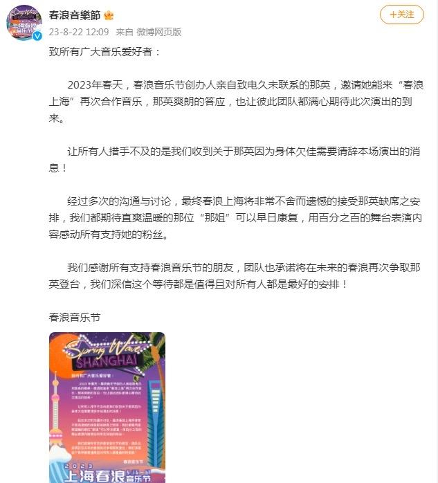 此前的8月22日,春浪音乐节官微发文称:那英因为身体欠佳将缺席上海春浪音乐节的演出,希望“那姐”可以早日康复,并承诺将在未来的春浪音乐节再次争取那英登台。