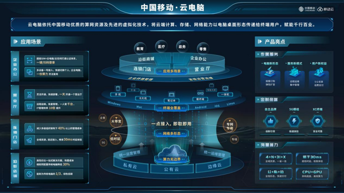 同时,聚焦小微企业办公、中大企业办公、营业厅、行业应用四大公有云场景,中国移动云电脑开展广泛外设适配、上架场景化应用、提供软硬一体化服务和差异化产品能力,形成了一体化解决方案。