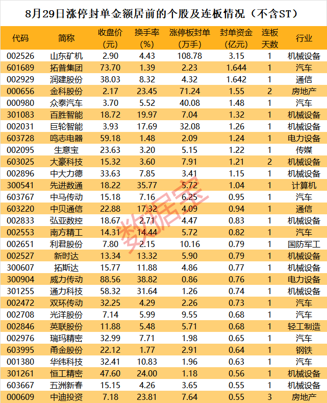 8月29日,A股市场共84股涨停(包含12只ST股),涨停家数创5月4日以来最高纪录。另外,25股封板未遂,整体封板率为74%。