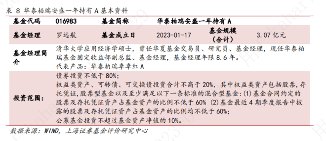 华泰柏瑞安盛一年持有A:采用积极纯债管理+权益基金增强的投资策略,权益基金投资上限为10%。通过配置权益基金的方式增强收益,使得基金经理能够更聚焦于纯债部分的投资。基金经理罗远航纯债投资能力突出,代表产品华泰柏瑞季季红A,任职期间两获金牛奖,一获英华奖。基金经理对债市行情把握能力强,且敢于做大波段操作,债牛强劲上涨,债熊防御有道。信用风格方面,对信用主体维持较高要求,不做下沉。