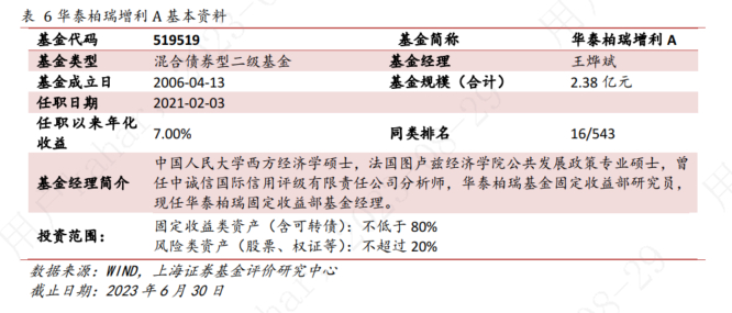 华泰柏瑞增利A:通过灵活的可转债和股票仓位博取收益,基于投资性价比在股票、可转债、纯债间,以及偏股性转债和偏债性转债间相互切换。受益于较小的基金规模,基金得以更多配置于超额收益效应更为显著的中小盘转债,持仓切换也更为灵活,重仓行业呈现明显的轮动特征。自现任基金经理王烨斌2021年2月3日任职以来,截至2023年6月30日,基金取得年化7.00%的收益水平,大幅跑赢同类平均水平,在同类中排名16/543,同期最大回撤-7.53%,也优于同类平均-8.26%。