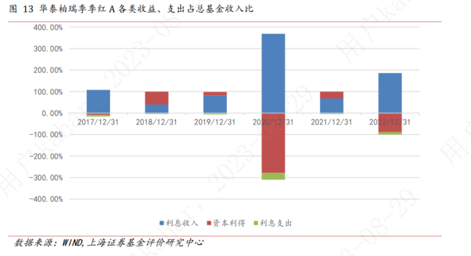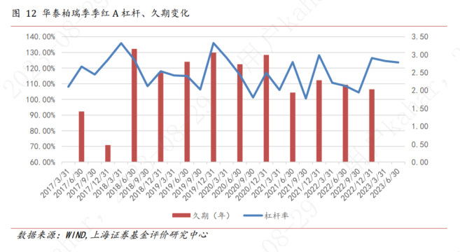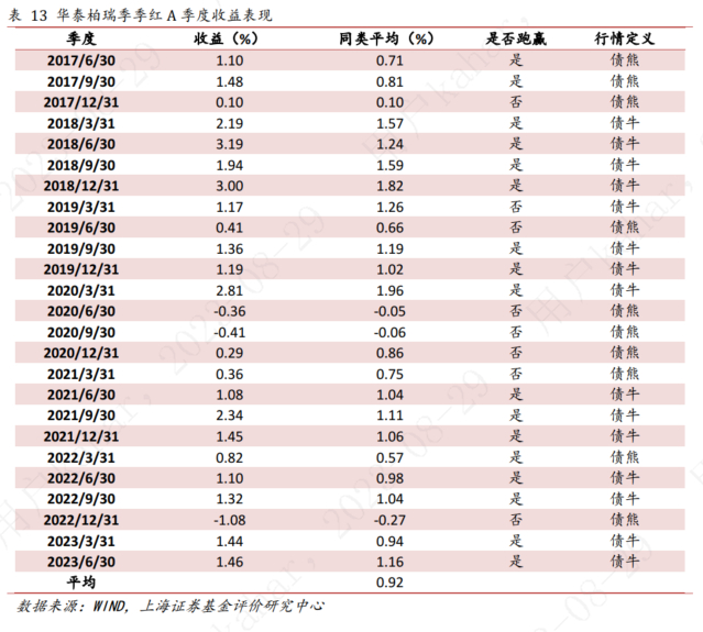 债牛强劲上涨,债熊防御有道。从2017年以来华泰柏瑞季季红A的各年度表现可知,在债牛行情中,基金能大幅跑赢同类,在其余多数年份表现则与同类接近,因而长期表现能领先同类。基金经理任职以来经历的25个完整季度,季度跑赢同类平均比例为68%,且跑赢季度的平均跑赢幅度为0.56%,远高于跑输季度的跑输幅度0.35%。将各季度同类平均收益水平进行统计,再取均值,定义当季同类平均收益高于25季平均时为“债牛”季度,反之为“债熊”季度。经统计,15个“债牛”季中,华泰柏瑞季季红A有14个季度跑赢了同类平均,跑赢概率高达93%,在10个“债熊”季度中,跑赢概率为30%。