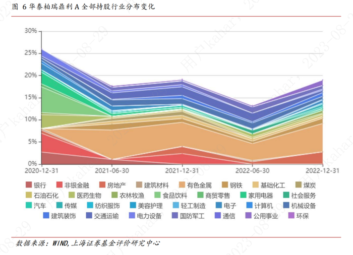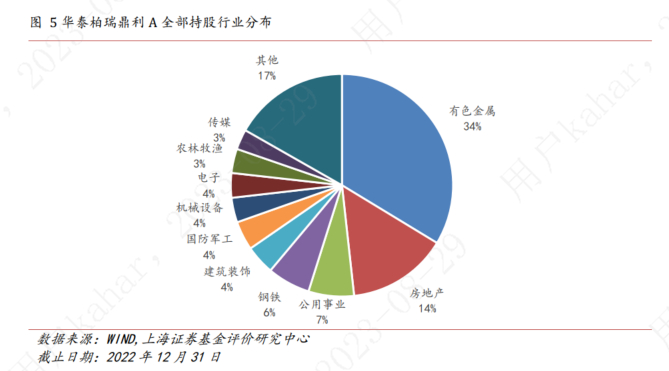 董辰曾任长江证券煤炭行业首席分析师,加入华泰柏瑞后任研究员期间,覆盖行业包括有色、钢铁、煤炭、机械、军工、电力设备等,其能力圈主要在周期、制造行业。董辰管理的基金持股价值风格显著,本基金自董辰管理以来,持股风格与董辰个人风格一致。行业分布上,有色金属行业长期位列第一大重仓行业,截止2022年末,第2至第5大重仓行业分别为房地产、公用事业、钢铁、建筑装饰,均为价值属性显著行业。从基金重仓股更迭情况来看,基金持股周期较长,重仓股留存度 较高,稳健的持股风格与固收增强的产品定位高度契合。
