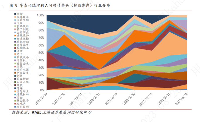 受益于较小的基金规模,基金得以更多配置于超额收益效应更为显著的中小盘转债 ,持仓切换也更为灵活,重仓行业呈现明显的轮动特征。