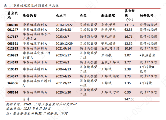 策略多样产品线齐全,基金经理配置合理高效。截至2023年2季末数据,华泰柏瑞旗下混合债券型一级、混合债券型二级、偏债混合型,以及在实际运作中符合固收增强定位 的灵活配置型基金合计规模超200亿。增强策略方面,既包括传统股债混合、转债增强,又有通过权益基金增强,产品线齐全。基金经理配置方面,尤擅价值风格投资的绩优基金经理董辰领衔权益投资,纯债金牛基金经理罗远航、何子建实力坐镇固收投资,多资产配置能手王烨斌以可转债投资见长,拥有多年货币基金管理经验的郑青在流动性管理上发挥优势,保证组合高效运行。