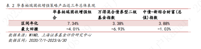 产品业绩优异。业绩方面,华泰柏瑞固收增强策略产品整体表现优异,以公司旗下满足条件的固收增强策略基金构建固收增强基金组合,组合近三年年化收益7.34%,远高于同期万得混合债券型二级基金指数3.38%的年化收益,最大回撤-4.01%,大幅优于同期万得混合债券型二级基金指数-6.93%的最大回撤,展现出极为优异的风险收益特征。