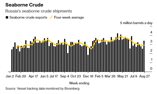 在俄罗斯于下个月将石油出口的削减规模从8月份的每日50万桶缩减至每日30万桶之前,其海运原油流量已攀升至八周新高。