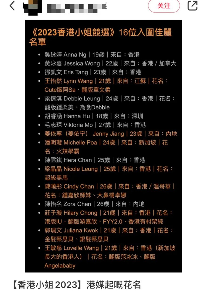 入围名单里大半选手被港媒取了花名,统统都是翻版,网友忍不住吐槽:这届港姐难道是没有姓名吗?