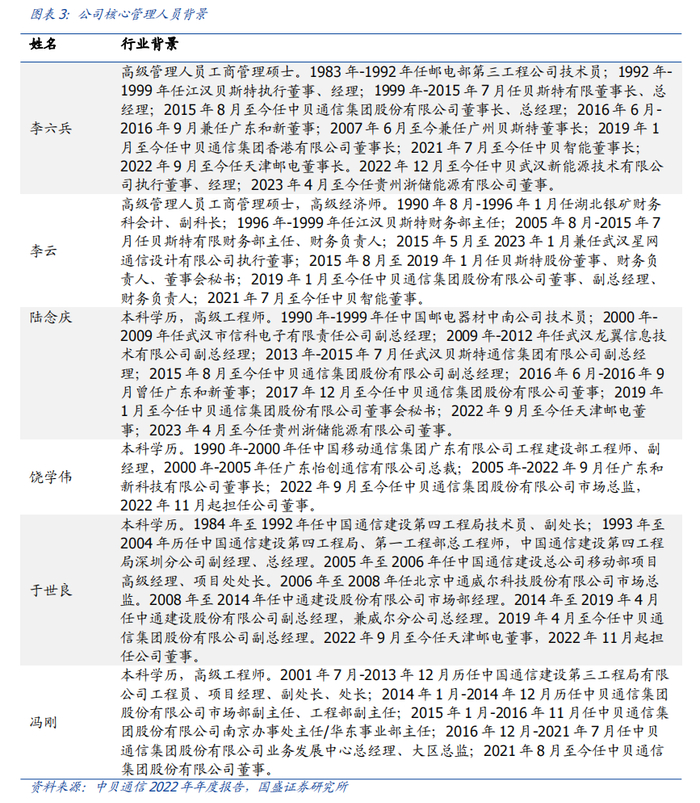 核心管理人员行业背景深厚,管理经验丰富。公司董事长、总经理李六兵先后担任广州贝斯特软件技术有限公司、广东和新科技有限公司、中贝通信集团香港有限公司、中贝通信集团(湖北)智能科技有限公司、天津市邮电设计院有限责任公司董事长,具备丰富的管理经验。