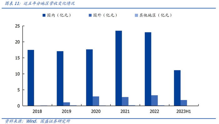 按地区拆分,国内是营收主要来源,海外业务发展迅速。公司营收以国内为主,2023年上半年,国内营收达到11.12亿元,占总营业收入的86%;海外业务营收达到1.82亿元,占营收比重14%(均以半年报披露的“合同产生的收入的情况”为统计口径)。公司国际业务增长较快,重点聚焦于核心优质客户与品质项目,采取 EPC(工程总承包) +I (投融资) + O(运维) + P&S(产品和解决方案)等多种方式开展业务合作,收入实现较大幅度增长,未来发展潜力巨大。
