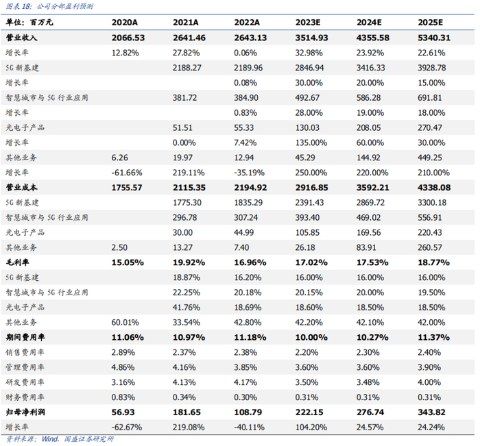 毛利率:1)5G新基建:下游客户为运营商,业务毛利率较为稳定,假设2023-2025年毛利率均维持在16%。2)智慧城市与5G行业应用:5G发展进入中后期,业务毛利率较为稳定,假设2023-2025年分别为20.2%/20.0%/19.5%。3)光电子产品:业务在21年初期毛利率较高,后伴随出货量增加价格让步,毛利率略有下滑,初步已经稳定,假设2023-2025年分别为18.6%/18.5%/18.5%;4)其他业务:毛利率较为稳定,假设其他业务2023-2025年毛利率分别为42.2%/42.1%/42.0%。