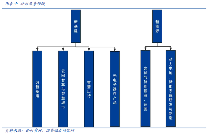 从行业来看,公司业务可以区分为两大类:新基建、新能源。在新基建业务方面,公司的5G新基建业务为国内外电信运营商提供一体化服务,包括5G移动通信、光传输系统等网络建设,涵盖网络规划与设计、项目实施与交付以及系统网络维护,具有全生命周期项目管理的特点。公司新能源业务主要涵盖光伏与储能的投资和运营,以及动力电池和储能系统的研发和制造等。