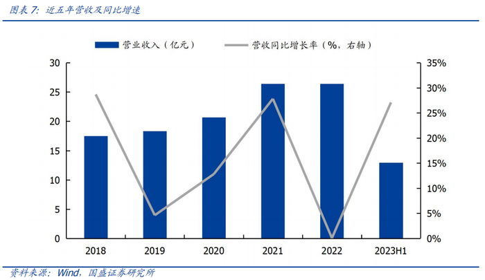 公司营收整体呈现稳定态势,2022年收入同比持平,2023年上半年营收逐步恢复。公司自2018年以来营收整体呈现稳步增长趋势,2019年以来同比增速逐年提高,2019/2020/2021年营收同比增速分别达到5%/13%/28%。2022年营收同比持平,主要受限于国内整体经济环境,交通受阻、出行不畅、项目停工等对项目实施效率产生较大不利影响。截至2023年上半年,公司营收达到12.94亿元,同比增长27%,营收逐步恢复。