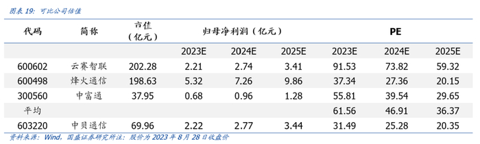 我们预测公司2023-2025年的归母净利润为2.22/2.77/3.44亿元,同比增速分别为104.2%/24.6%/24.2%,对应PE分别为32/25/20倍。公司是可视化龙头企业,我们选取同做IDC运维服务的烽火通信、中富通、同做算力租赁业务的云赛智联作为同业可比公司,2023-2025年可比PE均值分别为62/47/36倍。公司是国内新基建领域头部企业,主业提供新型数字基础设施提供网络建设服务,同时布局新能源与智算赛道,未来伴随AI算力需求重要性不断提升,公司营收有望实现高速增长,首次覆盖,给予“增持”评级。