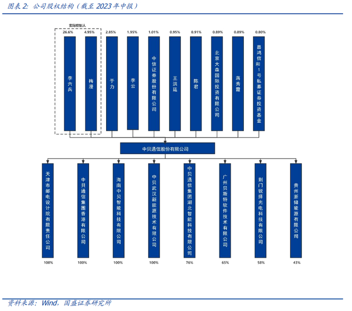 股权结构稳固,核心管理人员控股。公司控股股东、实际控制人为李六兵、梅漫夫妻二人,截至2023年半年报,二人分别持有公司股权26.60%、4.95%,直接持股比例合计为31.55%,李六兵之弟李云持股1.95%,公司股权相对集中,股权结构稳固;公司控股8家子公司,包含4家全资子公司,其中全资子公司天津邮电设计院有限责任公司负责5G新基建的设计业务;中贝通信集团香港有限公司负责国际5G新基建业务。2022年公司成立中贝武汉新能源技术有限公司,主营业务为太阳能发电技术服务、合同能源管理、储能技术服务和电动汽车充电基础设施运营等,推动公司主导业务和新能源业务相辅共进平衡发展。2023年3月中贝通信以增资及股权转让方式收购浙储能源集团有限公司43%股权,为提高公司构建新能源动力电池生产、储能系统集成和技术服务能力,加强公司在新能源领域的多元化布局,创造公司新利润增长点。