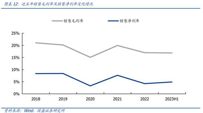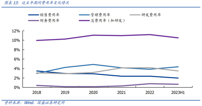 期间费用管控能力良好,整体费用率稳中有降。2023年上半年公司期间费用率为10.50%,较2022年底下降0.68个百分点,公司费用管控能力逐步加强;其中销售费用率、管理费用率、研发费用率、财务费用率分别为1.97%、4.37%、3.49%、0.66%,整体维持较为稳定的趋势。