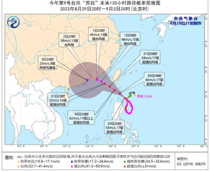 预计,“苏拉”将以每小时10-15公里的速度向西北方向移动,于31日早晨移入南海东北部海面,逐渐向福建南部到广东东部一带沿海靠近,有可能于9月1日夜间到2日上午在上述沿海登陆(台风级或强台风级,38-45米/秒,13-14级),也有可能在广东东部近岸海面向西偏南方向移动。
