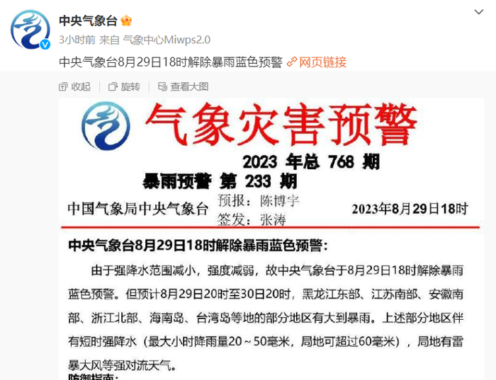 由于强降水范围减小,强度减弱,故中央气象台于8月29日18时解除暴雨蓝色预警。但预计8月29日20时至30日20时,黑龙江东部、江苏南部、安徽南部、浙江北部、海南岛、台湾岛等地的部分地区有大到暴雨。上述部分地区伴有短时强降水(最大小时降雨量20~50毫米,局地可超过60毫米),局地有雷暴大风等强对流天气。