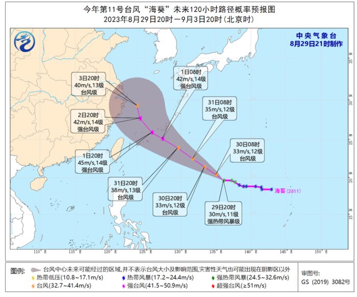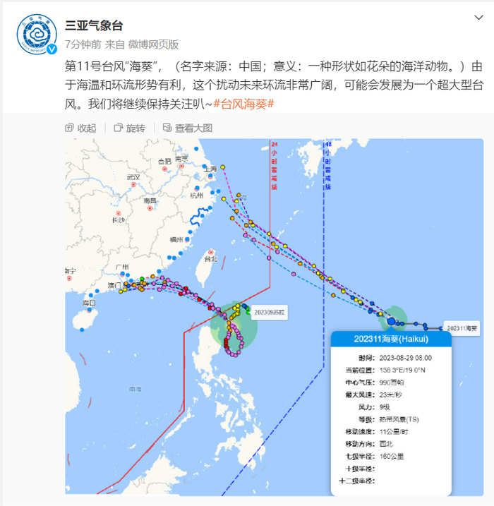 第11号台风“海葵”,(名字来源:中国;意义:一种形状如花朵的海洋动物。)由于海温和环流形势有利,这个扰动未来环流非常广阔,可能会发展为一个超大型台风。