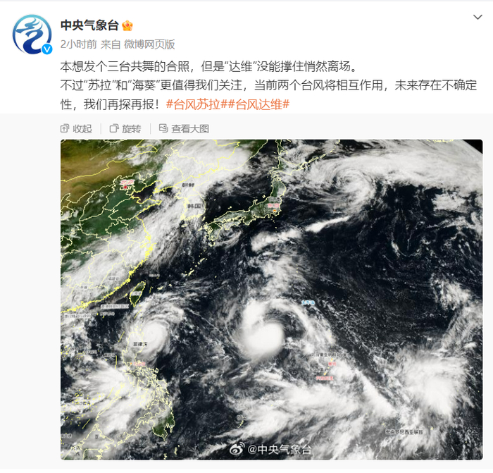 在第9号台风苏拉东侧,今年第11号台风海葵正在缓慢增强,并向西偏北方向移动。中央气象台台风专家指出,“苏拉”和“海葵”将产生双台风作用,未来路径预报存在不确定性。