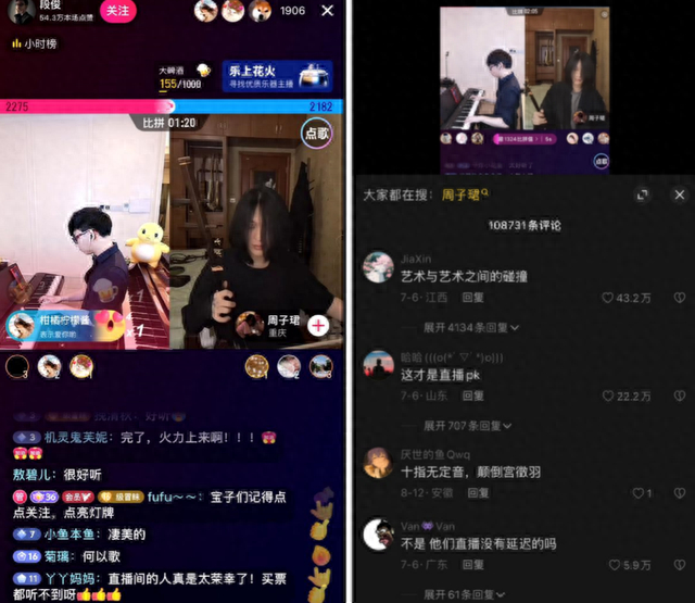 此前,周子珺与段俊二人就曾在直播间PK合奏“火出圈”。在一段记录二人PK的短视频中,这对组合合奏的一曲《何以歌》,累计吸引了200万人点赞,超10万条留言。网友表示,从他们的PK中,没有看到充满硝烟的挑衅,反而是以音符之间的跳动,完成了艺术上的共鸣,“这才是艺术与艺术的碰撞”。