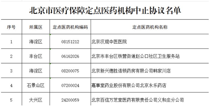 北京汉琨中医医院等5家定点医药机构因不能继续为参保人员提供服务,申请中止医疗保障服务协议,详见表格——