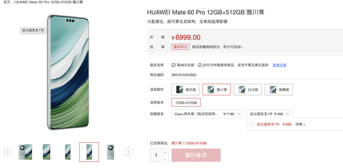 目前,华为官方商城挂出的Mate 60 Pro为12G+512G,四个颜色都有,但目前每种颜色都显示处于缺货状态。