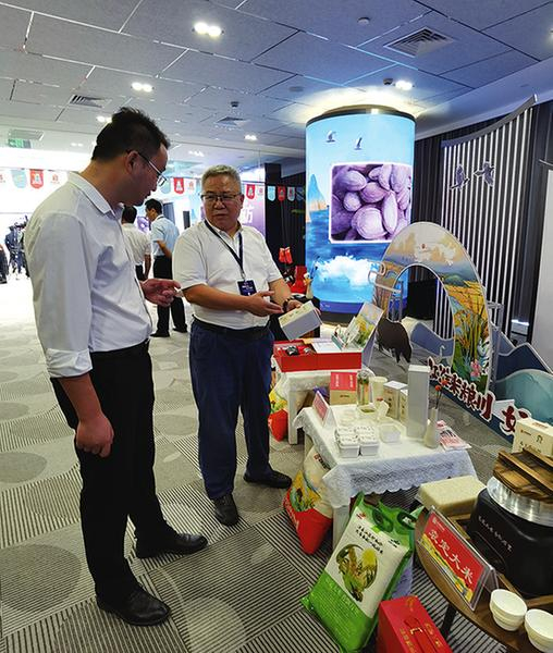 国家卫健委《健康指南》杂志社副社长徐新(右一)看到家乡“定有良材”众多农产品展示,高兴地当起了“讲解员”。