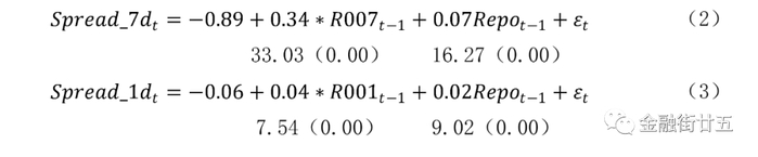其中:Spreadt为t日全市场金融机构与存款类机构间资金利率的利差,具体包括Spread_7dt(R007-DR007)和Spread_1dt(R001-DR001),单位为%。Ratet-1为前一日银行间质押式回购利率,具体包括R007t-1和R001t-1,单位为%。Repot-1为前一日银行间质押式回购成交量,单位为万亿元,c为常数。回归结果如下: