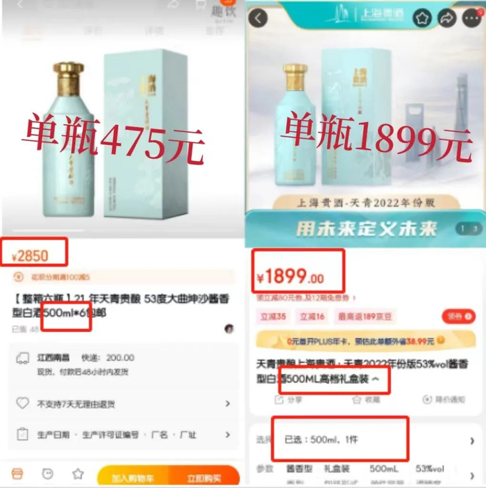 记者在淘宝平台随机挑选了一家酒行,该店2021年、500ML礼盒装、53度酱香型的天青贵酿给出内部价为一箱2400元(6瓶),折合每瓶400元,五箱起售。对于货源情况,相关客服回应“不方便说”,但其也强调产品保真,“这个酒不是茅台,没人去造假”。