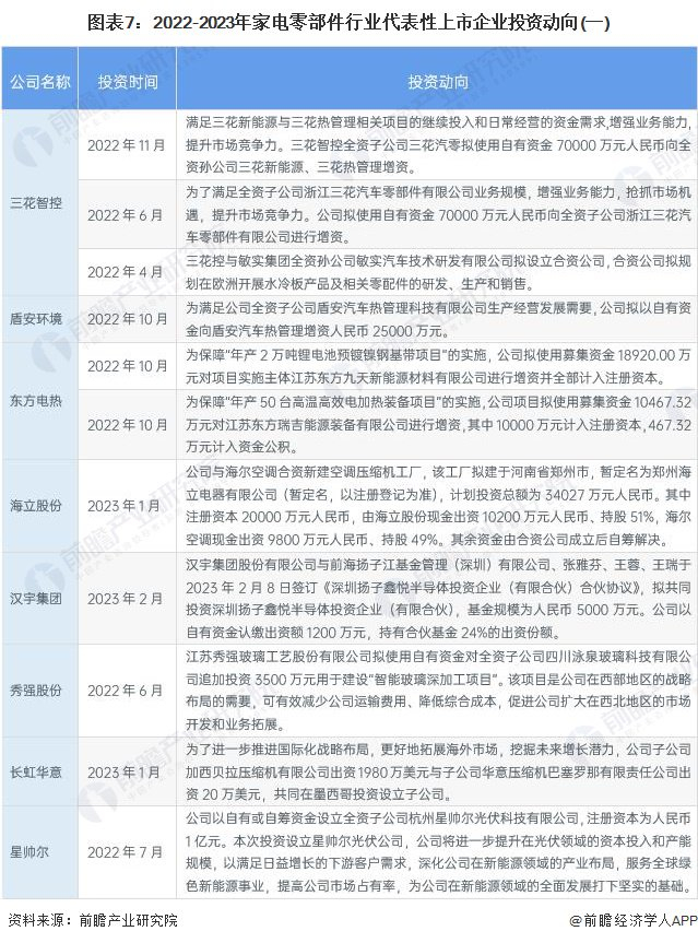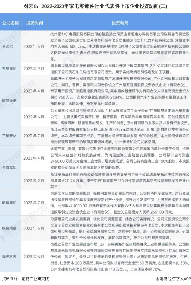 从代表性上市企业投资情况来看,家电零部件行业各企业对外投资战略主要为横向拓展、纵向延伸;以扩大家电零部件业务经营范围为基础,同时布局汽车零部件、光伏组件、新能源发电等多元化业务,进一步增加公司发展空间。2022-2023年家电零部件产业代表性上市企业最新投资动向如下: