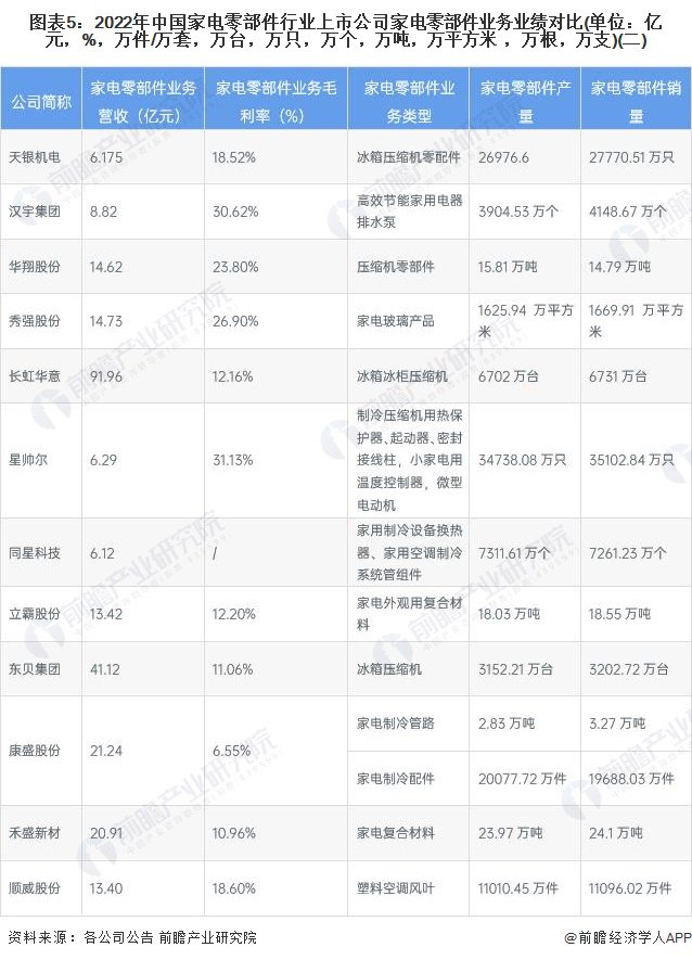 2022年,家电零部件行业27家上市公司中,以制冷空调电器零部件为主的三花智控家电零部件业务营收最高,为138.34亿元,其次分别为海立股份、长虹华意和盾安环境,家电零部件业务营收均超过50亿元;星帅尔家电零部件业务毛利率最高,为31.13%,其次为汉宇集团、秀强股份、三花智控、华翔股份、海达尔和三星新材,毛利率均超过20%;康盛股份制冷管路产销率最高,全年生产制冷管路2.83万吨,销售3.27万吨,其次是汉宇集团,产销率超过105%。