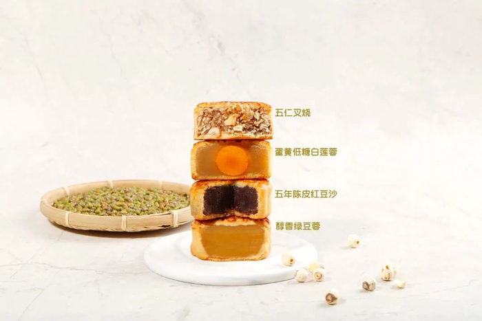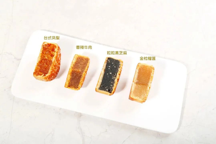除了五仁叉烧,还有莲蓉、豆沙、绿豆、黑芝麻等传统口味,更有五年陈皮红豆、优质土凤梨、泰国金枕榴莲、香辣牛肉等新口味,可满足人们对广式月饼的所有想象。