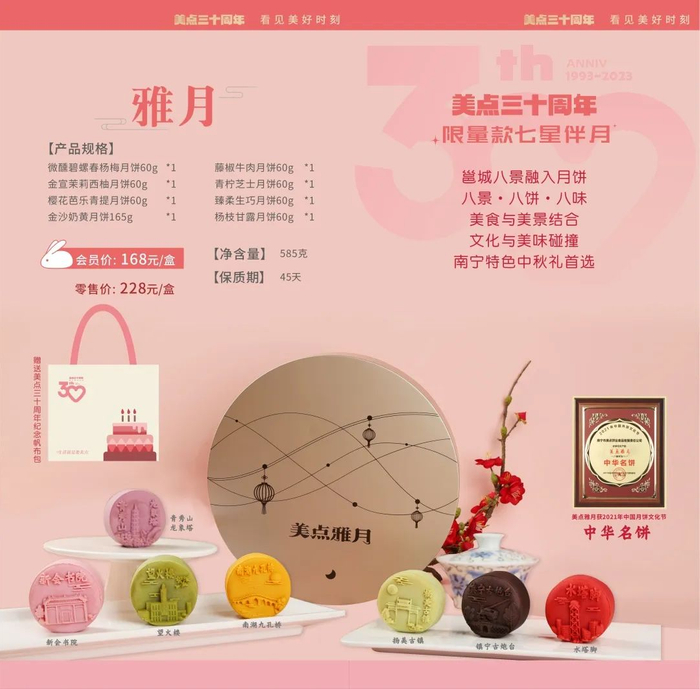 今年中秋,美点特别推出了30周年纪念款月饼——美点雅月礼盒,将邕城八景之会展中心、镇宁古炮台、望火楼、南湖九孔桥、新会书院、水塔脚、扬美古镇、青秀山、龙象塔融入精致的桃山月饼中,八景八饼八味,口感清爽不腻,造型独具匠心。