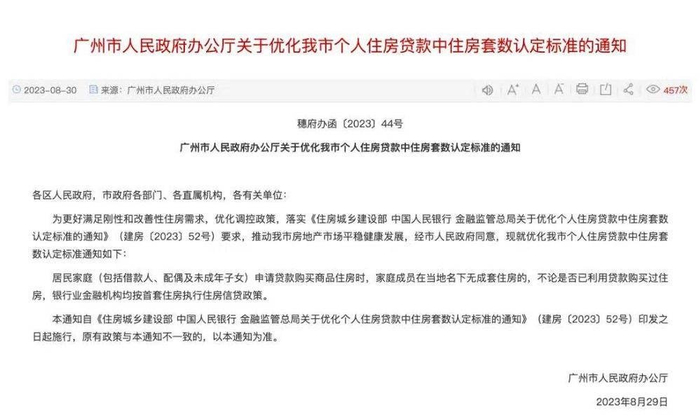 8月30日,据广州市人民政府网站,广州市人民政府办公厅日前发布了通知,优化广州市个人住房贷款中住房套数认定标准。