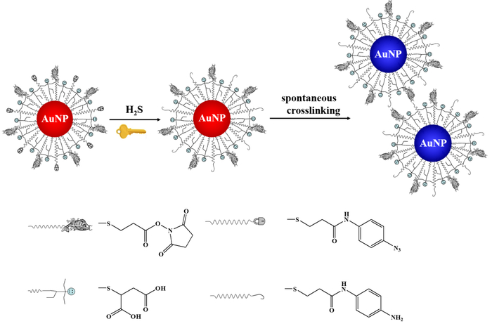 例如,如下图所示在金纳米颗粒表面修饰上叠氮苯和活性酯后,如果接触了硫化氢(一种有毒气体),硫化氢就可以将叠氮苯还原成苯胺,随之与活性酯反应生成酰胺化合物,并诱导金纳米颗粒聚集发生变色[2],于是我们就知道,附近可能存在硫化氢。同样的,在金纳米颗粒表面修饰上不同的具有类似功能的基团,就可以用来检测很多不同的物质。