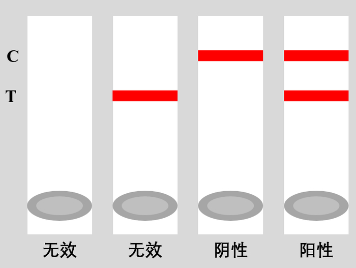 此时,试纸还在两个区域分别包埋了毒物抗体和对照抗体。与毒物结合的金纳米颗粒会在特定区域形成“抗体-毒物-抗体”夹心复合物沉积并显红色,这个区域称为检测带(也叫 T 线)。而没有与毒物结合的金纳米颗粒则会另一个区域沉积显色,这个区域称为对照带(也叫 C 线)。