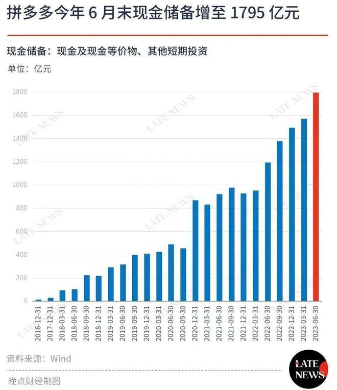 今年 6 月底,拼多多账上的现金、现金等价物和短期投资加起来有 1795 亿元,比三个月前又多了 200 多亿元。虽然还远落后于腾讯、阿里,但已经追近京东、略超美团。