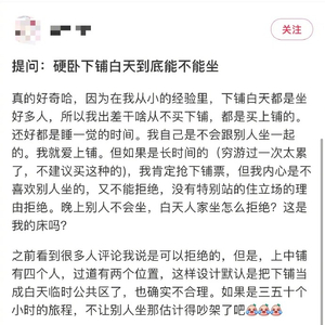 有网友表示自己购买到卧铺火车下铺车票时,常有其他铺位乘客坐在自己的床上,自己不喜欢但又不好意思拒绝。有人跟帖表示,如果好好沟通,有分寸感,并不讨厌别人暂时坐自己的铺位,矛盾的根源是有些人坐自己的铺位时没有分寸感,“一屁股坐我脚上还不吱声”。
