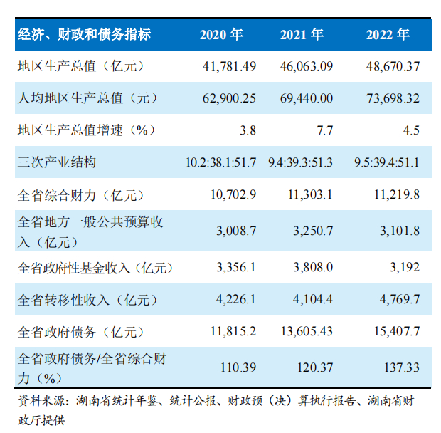 上述评级报告称,2022年湖南省国资系统监管企业实现利润约474亿元,同比增长3.5%,截至2022年末,上述企业资产总额约5.5万亿元,资产负债率为 64.81%,债务负担保持稳定,整体经营良好,可为政府债务偿还和周转提供一定的流动性支持。