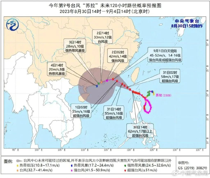 今年第9号台风“苏拉”(超强台风级)的中心今天(8月30日)14时位于广东惠来东偏南方向约520公里的海面上,中心附近最大风力超过17级(62米/秒)。预计“苏拉”将于30日夜间或31日凌晨移入南海东北部海面,有可能于9月1日白天在广东东部到福建南部沿海登陆(强台风或超强台风级,45~52米/秒,14~16级),也有可能在广东东部近岸海面向西偏南方向移动。