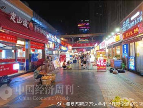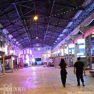 厂房改造成的夜市摊点区排列着几个空荡荡的摊位,让人不由产生一种有小贩吆喝的话会有回音的错觉。不远处搭着个简易的迷你舞台,一个头发浸满汗水的“网红”卖力地对着手机边跳边唱,不远处几个小孩子在台下打闹。整个厂房里只有这里稍显热闹。