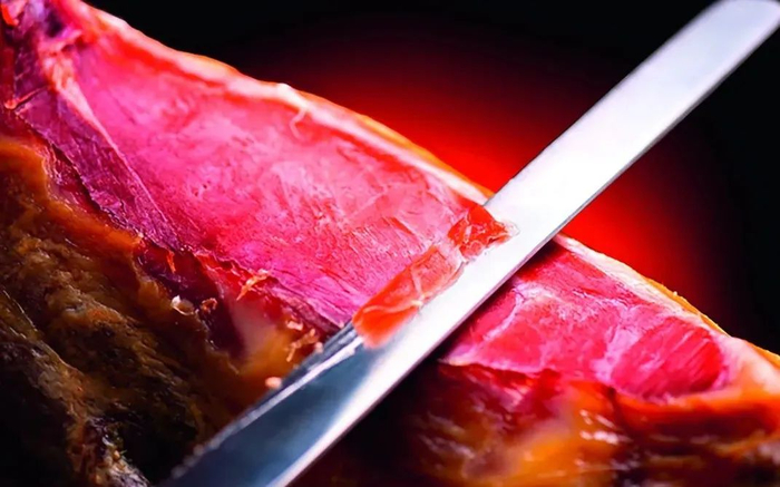 猪后腿经过盐的腌渍和风干,会呈现鲜红如火的颜色,因此得名“火腿”。