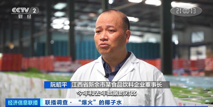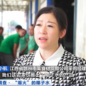 江西省新余市某食品饮料企业董事长 阮昭平:今年和去年的数据对比,产量已经增长了600%。现在我们一天生产100多吨椰子水,基本上产品出来后,三天之内就销售一空。