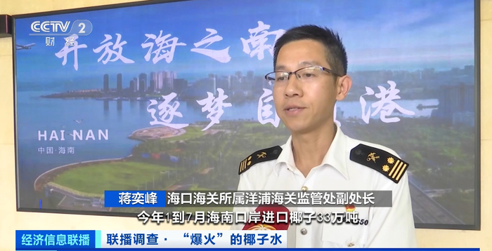 海口海关所属洋浦海关监管处副处长 蒋奕峰:今年1到7月海南口岸进口椰子33万吨,同比增长13.6%,货值约5.5亿元,主要从越南和印尼等国家进口。