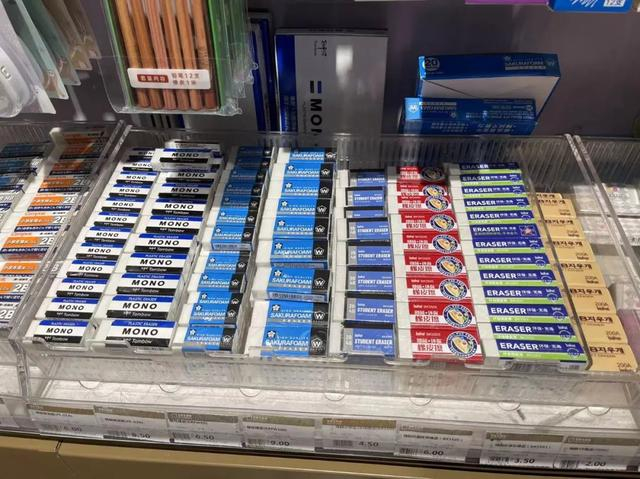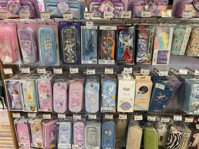 让孩子们和家长逗留时间较长的是铅笔、橡皮、笔袋的货架前,可以选择的款式太多了。