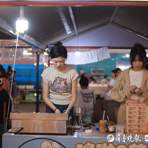 正值旅游旺季,每当夜幕降临,蓬莱八仙集市便拉开热闹的氛围,在灯火阑珊和欢声笑语中迎接着悠闲的市民以及五湖四海的游客。而此时,王雪珊和朋友也开始忙碌起来,夜市摊主是她们的另一个身份,现场制作售卖铜锣烧。