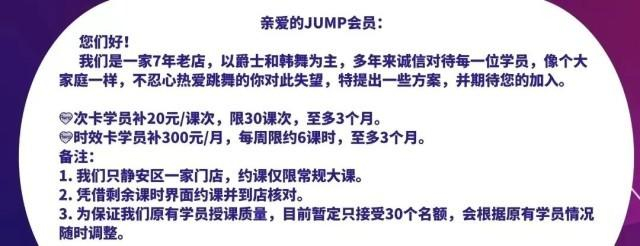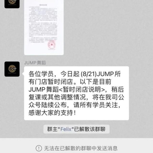 据上海新闻广播报道,近日,有上海市民反映,一家名叫JUMP的连锁舞蹈工作室,在凌晨两点半时突然解散所有客户微信群,并发布闭店通知。