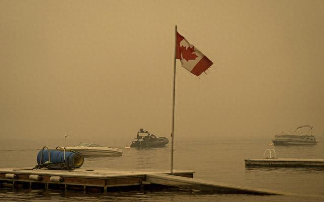 当地时间2023年8月20日,加拿大不列颠哥伦比亚省野火肆虐,浓烟弥漫在舒斯瓦普湖上,省内各地发布空气质量警报。