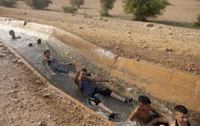 当地时间2023年8月14日,约旦河西岸约旦河谷,夏日炎炎,孩子们在水渠中戏水降温。